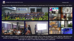 Os estudantes do turno Adventureiros de Loiola (turmas A, B e C) participaram também numa visita de estudo ao laboratório de litoteca e fósseis do Instituto de Geociências de Timor-Leste (IGTL). O objetivo desta visita foi compreender melhor os conceitos da geologia relacionados com a flora e fauna do passado, bem como conhecer o processo de fossilização, a idade dos fósseis, as fácies fósseis, a classificação taxonómica e a conservação dos fósseis nas rochas. Além disso, os estudantes puderam compreender a importância dos fósseis para o estudo da história da vida na Terra e para a compreensão da evolução do nosso planeta.